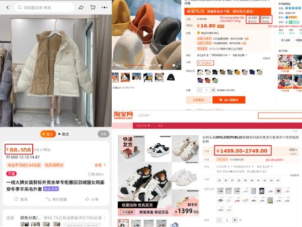Khi vào trang chi tiết, Taobao hiển thị giá bán bằng Nhân dân tệ (¥) với giá hiện tại nổi bật, giá gốc gạch ngang và có thể kèm các mức giá theo số lượng (sỉ/lẻ). Việc quy đổi sang VNĐ thường được thực hiện ở bước thanh toán thông qua đơn vị mua hộ/vận chuyển hoặc thẻ ngân hàng, với tỷ giá tham chiếu khoảng 3.500 – 3.700 VNĐ/CNY.