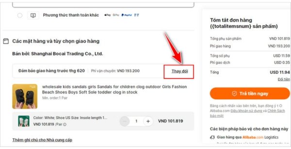 Ở mục Vận chuyển, bạn có thể nhấn “Thay đổi” để so sánh phí ship giữa các đơn vị