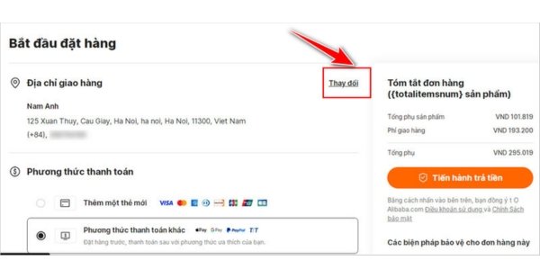 Chọn “Thay đổi” nếu cần chỉnh sửa địa chỉ nhận hàng