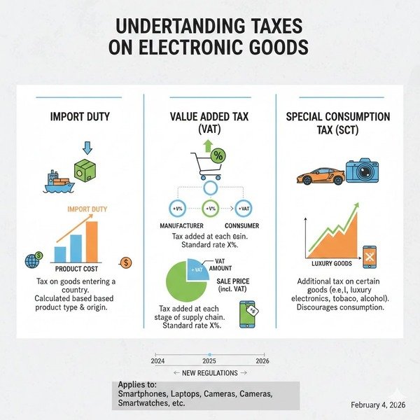Thuế giá trị gia tăng (VAT) áp dụng cho hầu hết các mặt hàng điện tử nhập khẩu. Mức thuế VAT phổ biến hiện nay là 8% hoặc 10%, tùy từng thời kỳ và loại sản phẩm cụ thể.